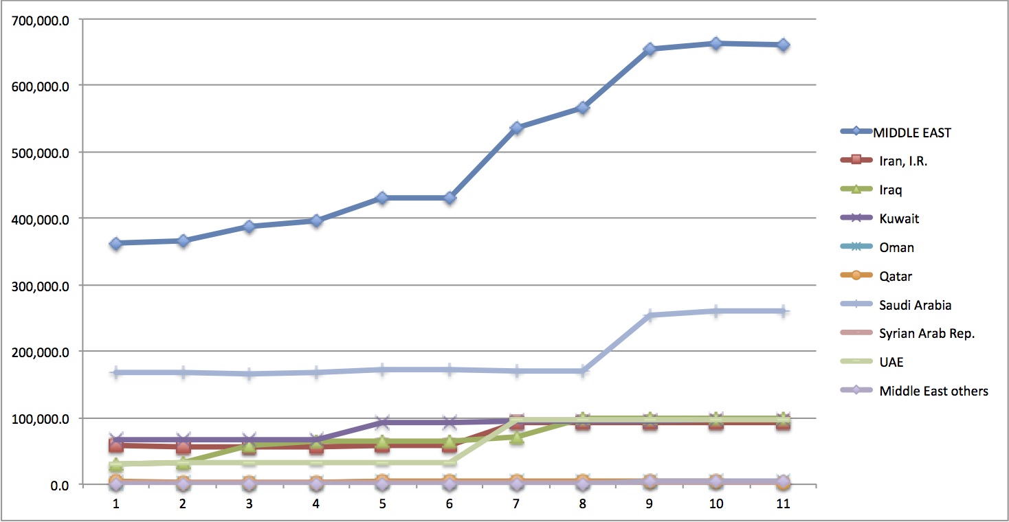 The units shown on the vertical axis are in thousands of barrels of oil. The horizontal axis shows eleven years from 1980 thru 1990. Between 1983 and 1984, Kuwait’s reserves jump from 67 billion barrels to 92.7 billion barrels. The Wafra oil field was discovered in 1984 and accounts for this increase.